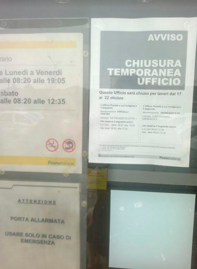 "Il Gruppo Poste Italiane Sede di Santhià informa che da lunedì 17 ottobre a sabato 22 ottobre gli Uffici saranno chiusi", si legge nell'avviso.