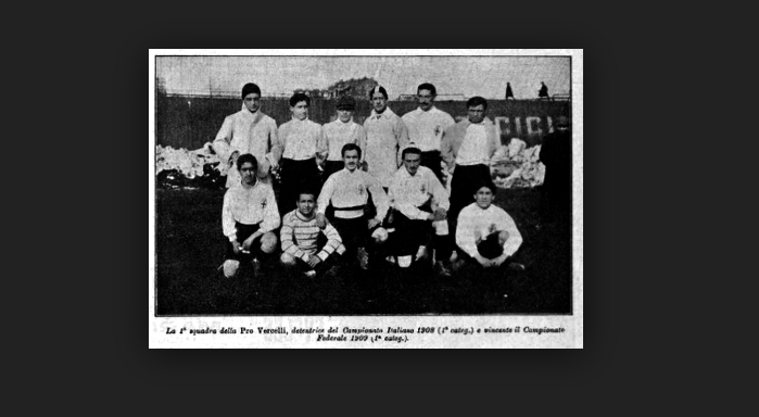 È proprio nel primo quarto di secolo di football tricolore, periodo storicamente esteso dalla repressione dei moti popolari milanesi contro i governi reazionari alla marcia su Roma con la presa al potere del fascismo di Benito Mussolini, la Pro vanta nel proprio curriculum ben sette scudetti (per un totale di otto titoli), vinti in soli quattordici anni (che diventano dieci perché durante la Prima Guerra Mondiale del '15-'18 i tornei vengono ufficialmente sospesi) e dunque conquistati trionfalmente tra il 1908 e 1922. Vercelli, come si sa, è una cittadina a metà strada esatta sia da Milano sia da Torino, allora come oggi, due metropoli fondamentali tanto su un asse europeo quanto nel contesto sociopolitico nazionale.