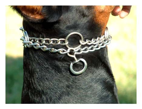 Il collare a strozzo è -ovviamente- un collare, che può essere metallico (a catena, con maglie più o meno lunghe) oppure in corda. In entrambi i casi è dotato di due anelli alle estremità in modo da poter formare un cappio che si stringe tirando, fin qui penso che la nozione sia nota a tutti.