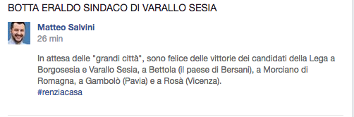 "In attesa delle grandi città - ha scrittoSalvini - sono felice delle vittorie dei candidati della Lega a Borgosesia e Varallo...".