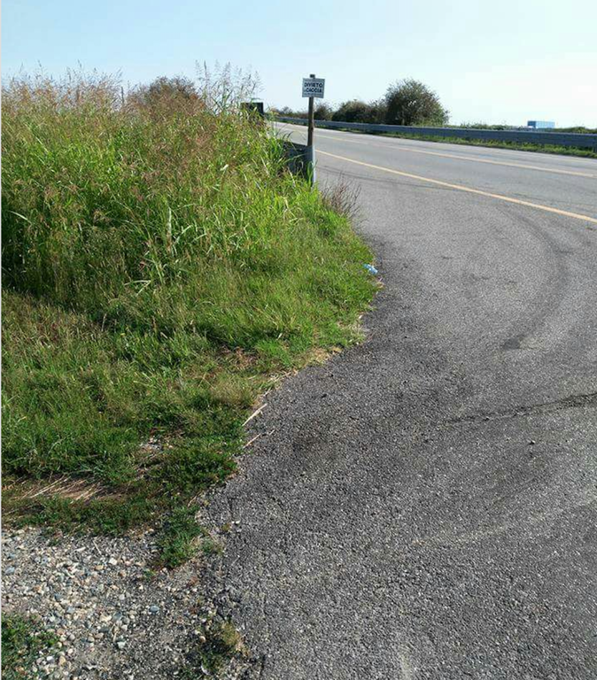 Tra l'altro, come mostrano le foto, per immettersi sulla strada principale occorre spostarsi quasi verso la riga gialla: le erbacce cresciute a dismisura non permettono la visuale e il guardrail particolarmente alto rendono difficile vedere chi sopraggiunge.