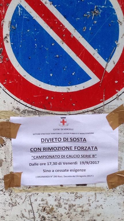Questo cartello, posizionato in via Tripoli, comunica che domani si giocherà una partita di serie B (quanto saranno felici alessandrini e livornesi nell’apprendere di essere stati promossi di una serie dalla città di Vercelli) e creerà problemi con il calendario, tutti si chiederanno “ma siamo impazziti o oggi è il 15 e non il 19 settembre”?