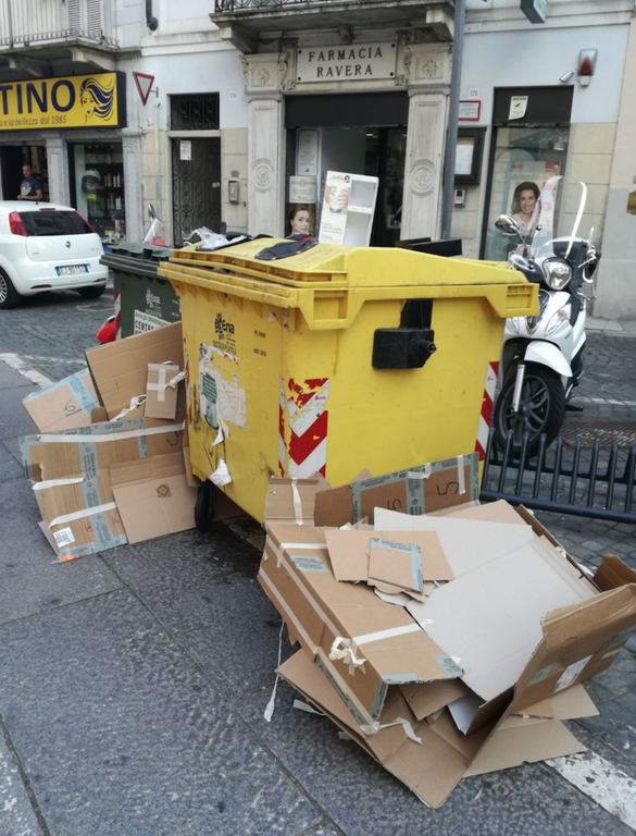 Qualcuno arriva con la scatola contente bottiglie di plastica, infila diligentemente le bottiglie nel cassonetto poi, quando il contenitore è vuoto, non trova di meglio che abbandonarlo in strada, infilandolo tra le due campane per la raccolta di plastica e vetro.