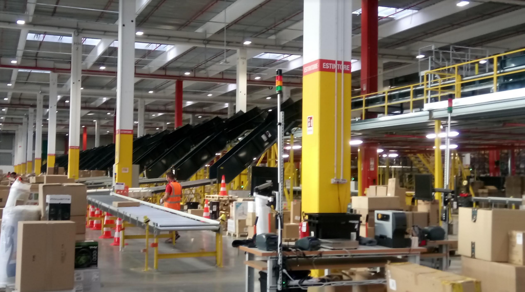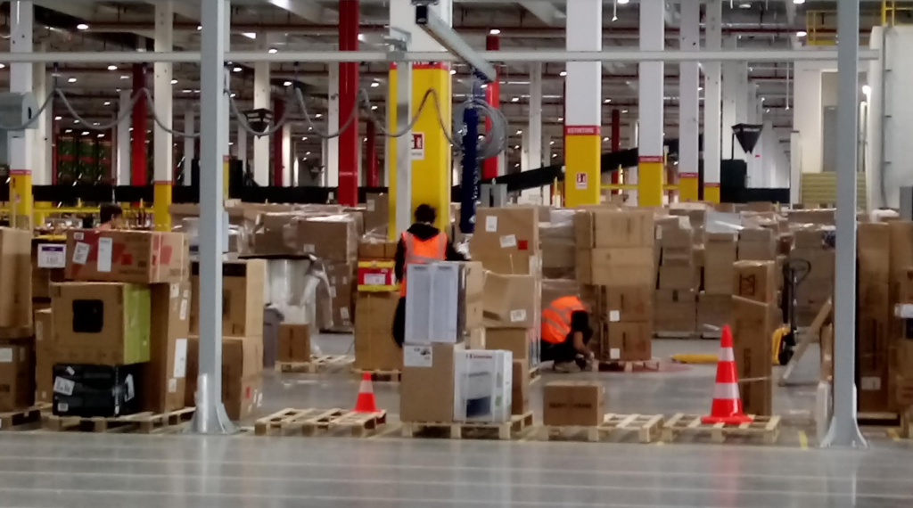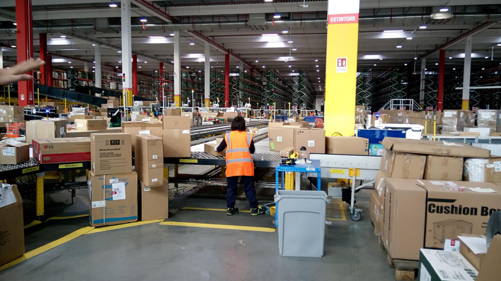 Sui nastri trasportatori del grande polo logistico Amazon di Larizzate viaggiano pacchi e pacchetti di tutte le dimensioni. Sugli immensi scaffali, alti fino al soffitto, sono stoccati maxi cestelli colmi di ogni prodotto. Dal seggiolino per l'auto alla casa di Barbie, dai materassi agli elettrodomestici, dalle panche per il fitness ai dischi in vinile.