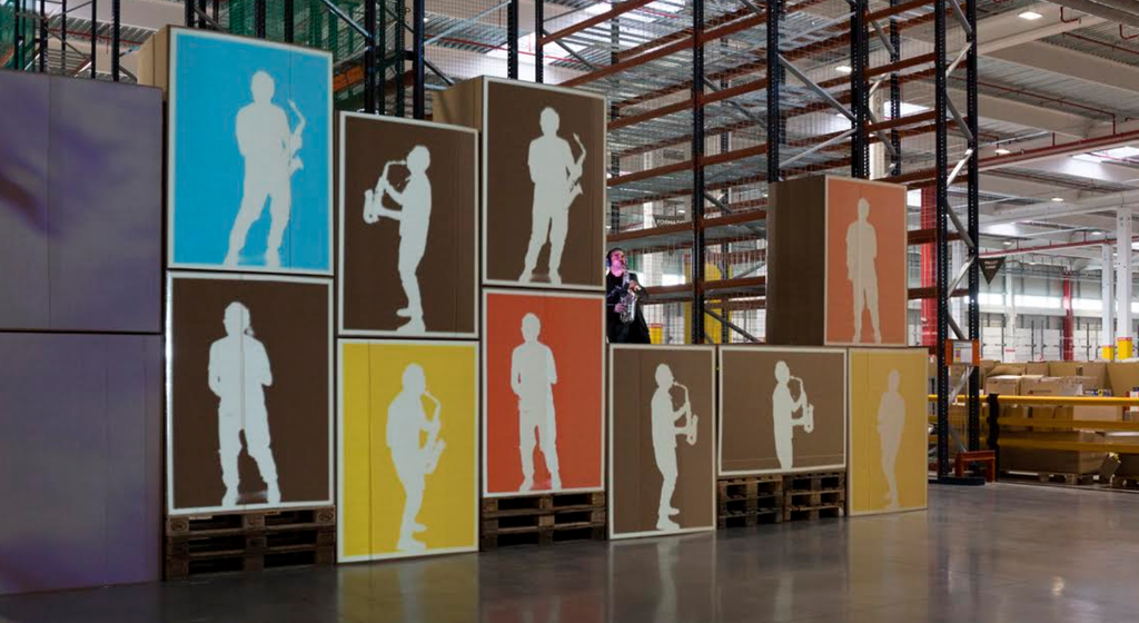 I quattro artisti torinesi hanno campionato e mixato i suoni dei centri di distribuzione Amazon, trasformando la “voce” dei nastri trasportatori e dei lettori di codice a barre in vera musica. Anche le scatole, simbolo del magazzino, sono entrate a far parte della performance divenendo la scenografia impiegata per la proiezione delle immagini.