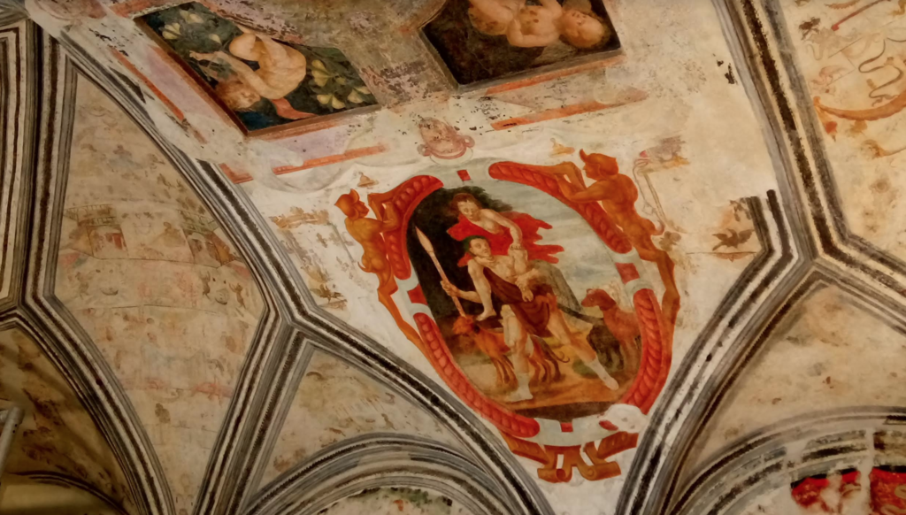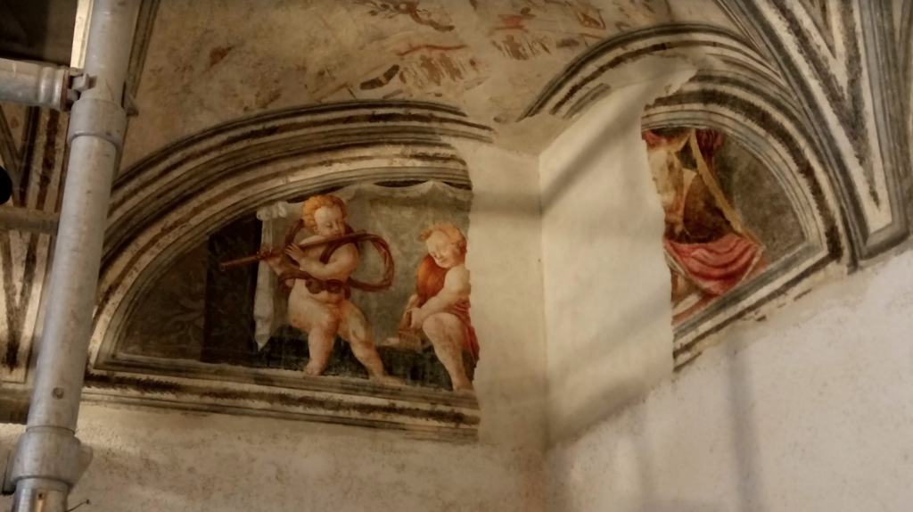 La sala è sorprendente già dalla struttura architettonica, con la volta caratterizzata da volta, lunette e unghiature affrescate in varie epoche e con soggetti diversi che, da soli, potrebbero catturare lo sguardo dei visitatore per ore. I più antichi, forse, sono tre-quattrocenteschi e ricordano all'occhio profano, le decorazioni delle tombe egizie. Forse anche per questo l'hanno ribattezzata "la sala delle mummie". I più recenti sono soggetti a tema religioso che ci si aspetterebbe in una sacrestia: opere del 1500 e del 1600 che nel giro di qualche settimana ancora verranno restituite all'antico splendore.