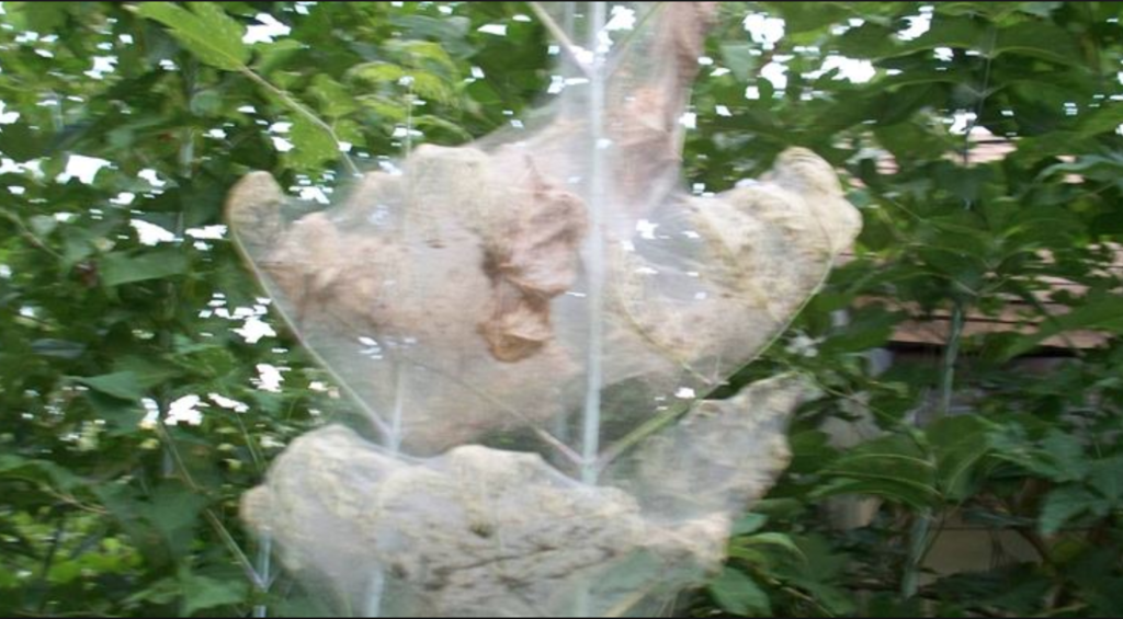 – L'Ifantria non costruisce i tipici nidi bianchi cotonosi della processionaria ma ragnatele di fili sericei intorno ai germogli dove le larve di prima età si nutrono e trovano riparo;