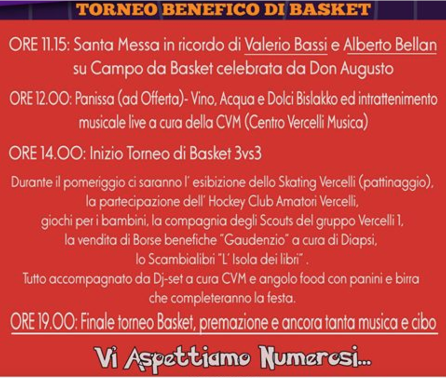 Alle 14 prenderà vita il Torneo Benefico di Basket 3vs3, al quale ci si potrà iscrivere con un contributo di 10 euro a giocatore (per informazioni e iscrizioni contattare 340/2506311 e 333/9621047).