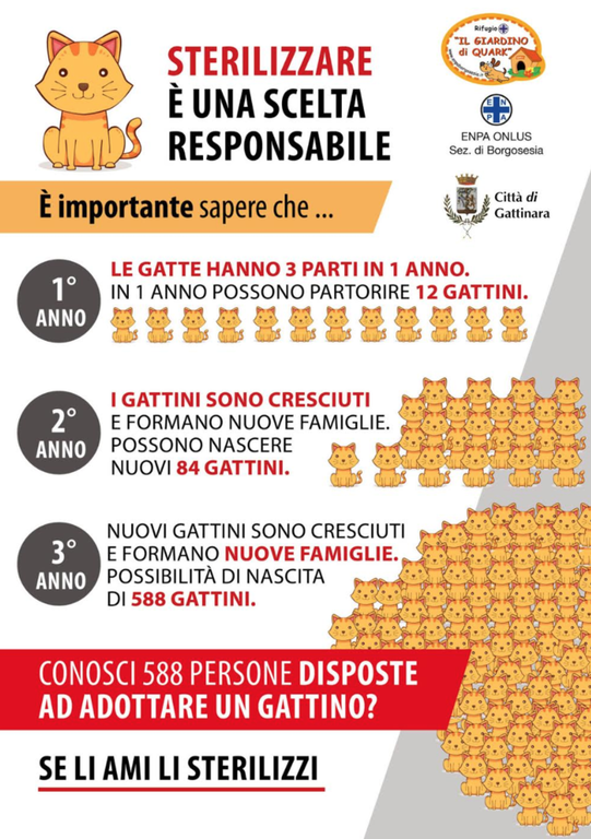 Il Comune di Gattinara, Enpa e “Il Giardino di Quark” si fanno promotori della campagna di sensibilizzazione “Sterilizzare è una scelta responsabile” a favore della sterilizzazione dei gatti.
