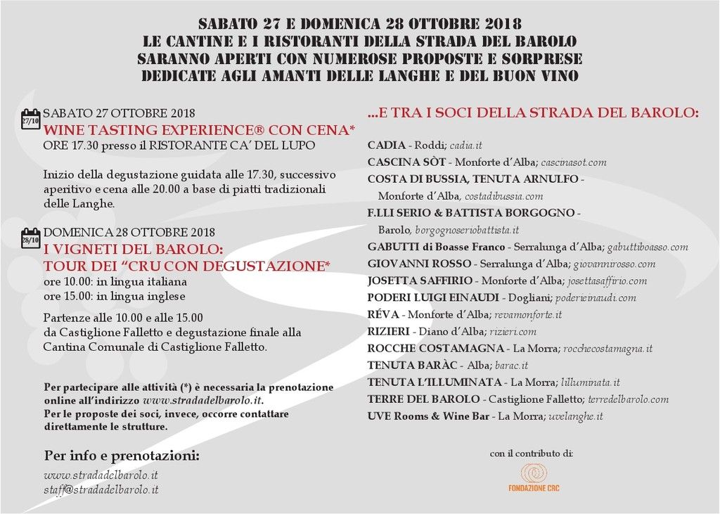 Come ogni anno i soci della “la Strada del Barolo” metteranno a disposizione dei turisti i propri servizi, con una serie di offerte speciali solo per il week-end del 27 e 28 ottobre 2018: gli amanti del Barolo e degli altri grandi vini delle Langhe avranno la possibilità di visitare le cantine in cui si produce il celebre Re dei Vini, potranno incontrare di persona i produttori e degustare i loro vini. Per tutti i buongustai i ristoranti della Strada del Barolo proporranno dei menu ad hoc con i piatti tipici della tradizione langarola, preparati con gli ingredienti più genuini.