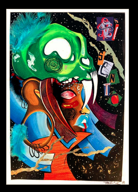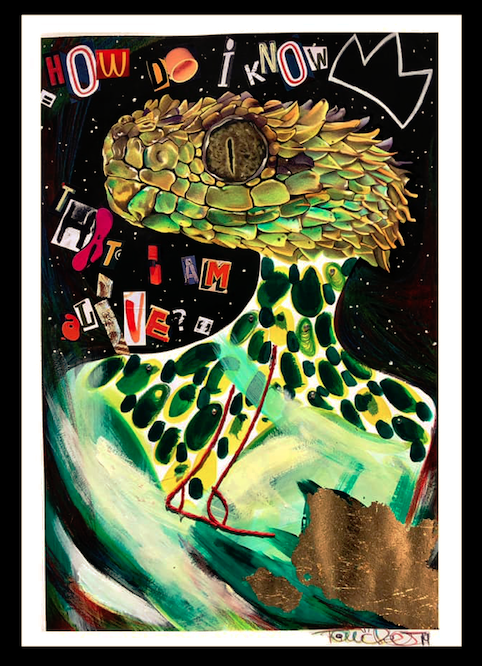 “Attualmente sperimento molto e mixo varie tecniche. Ho iniziato con le matite, ovviamente reiterando i tratti e calcando pesantemente. Erano strumenti che non avevo mai preso in considerazione, poi ho cambiato il modo di guardarle” Ora le associa all’acrilico e ai colori ad olio “Amo l’odore dell’olio di lino, quando posso infilo colori ad olio dappertutto”. Usa la foglia oro in maniera dissacrante “La appiccico con la colla. Mi piace l’effetto. E poi, perché no?”. Così come le stampe che troviamo in alcuni dipinti. “Le ho stampate tempo fa. Era il mio periodo della stampa immagini. Trovavo immagini che mi piacessero e le stampavo. Ad un certo punto me ne sono ricordata, sono tornate utili e ne ho fatto dei collages. Ad esempio adesso tengo le pietre gessose profumate. Quando le rompo e si sgretolano si trasformano in una texture molto interessante che quasi sicuramente inserirò nei miei quadri. Perché comincio ad aver bisogno di sentire i quadri che creo. Devo toccarli e devono avere una presenza. Ma non ho ancora deciso quando”.