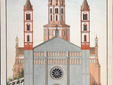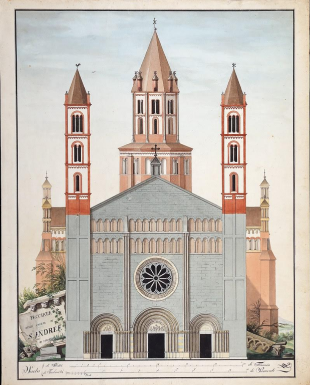 Una delle tavole più belle, sicuramente assieme a quella che raffigura una veduta interna della chiesa abbaziale, è quella che mostra frontalmente l’edificio, così bella e di impatto che è stata utilizzata, affiancata al ritratto che raffigura Guala, come immagine simbolo per la realizzazione della locandina e di tutto il materiale di comunicazione della mostra che si terrà in Arca.