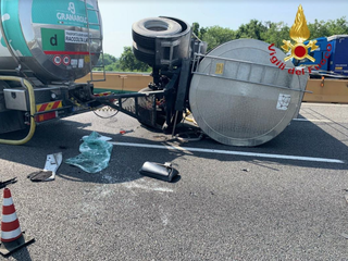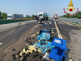 Circolazione interrotta per un gravissimo incidente stradale avvenuto, intorno alle 15,30 di mercoledì sulla A4 Torino Milano tra i caselli di Santhià e Carisio. Due autoarticolati - un camion a rimorchio trasportante latte e un bilico - si sono tamponati. A seguito dell'urto il rimorchio si è rovesciato invadendo la carreggiata.