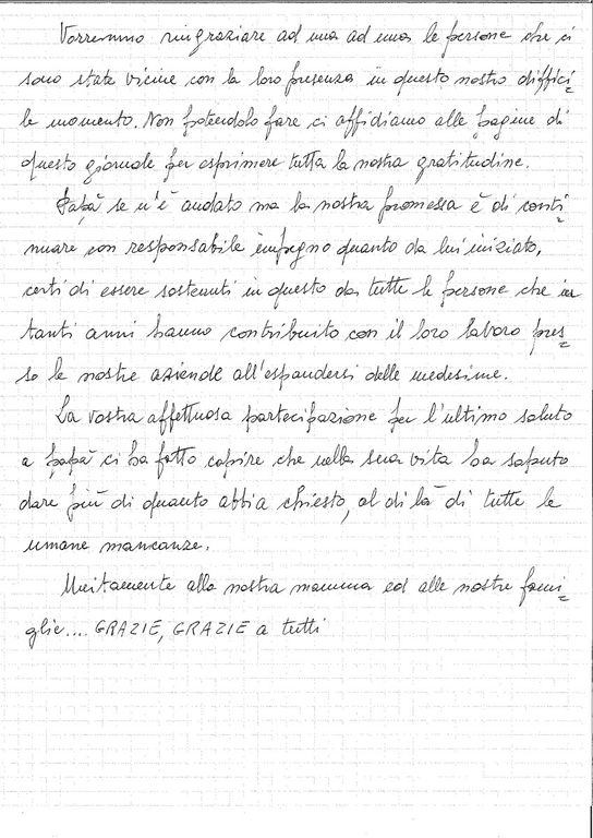 La vostra affettuosa partecipazione per l’ultimo saluto a papà ci ha fatto capire che nella sua vita ha saputo dare di più di quanto abbia chiesto, al di là di tutte le umane mancanze.