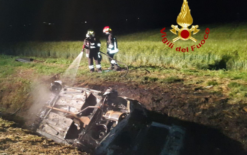 Finisce fuori strada ribaltandosi in un fosso a lato della carreggiata e l'auto prende fuoco. Pauroso incindente, nella serata di venerdì 1 maggio, intorno alle 22 in frazione Lachelle di Ronsecco.