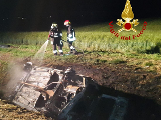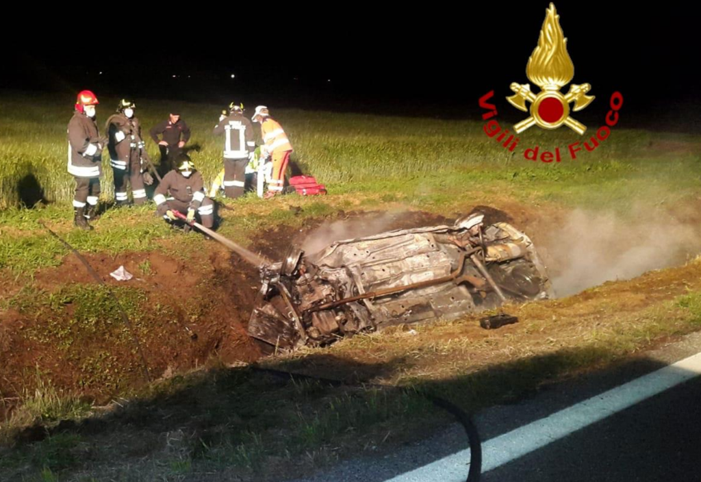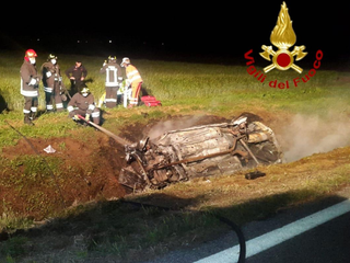 Una vettura, al cui interno viaggiava una sola persona, è finita fuori strada, ribaltandosi nel fosso che delimita le risaie. La persona che si trovava al volante, seppur ferita, è riuscita a uscire autonomamente dal veicolo prima che questo prendesse fuoco.