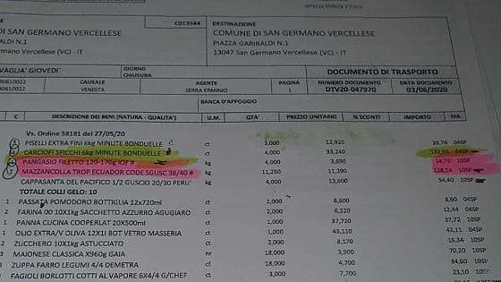 Finisce alle testate giornalistiche la "lista della spesa" che, nel corso dell'emergenza Covid, il Comune di San Germano ha avallato facendo acquisti anche da una ditta del Verbano specializzata nel pesce. E, tra passata di pomodoro, farina, zucchero, olio extravergine e fagioli, spuntano anche capesante del Pacifico, mazzancolle tropicali, salamini, stinco cotto. Prodotti acquistati per i pacchi cibo che il Comune ha distribuito alle famiglie in difficoltà nel corso dell'emergenza Covid scegliendo di gestire in proprio i fondi degli aiuti alimentari (e non di fornire i buoni spesa utilizzabili direttamente dai destinatari finali).