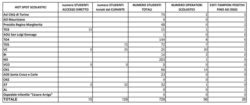 Dall’inizio dell’anno scolastico, i casi di positività attualmente riscontrati attraverso gli accessi diretti sono stati 26: attraverso hot spot del Vercellese sono stati scovati 5 casi, mentre nella giornata di mercoledì hanno effettuato il tampone 25 studenti (inviati dal medico e non dalla scuola per un malore in atto) e 20 operatori scolastici.