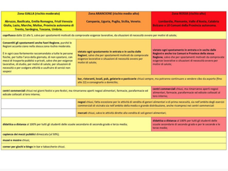 Rispetto alla scorsa primavera, restano attivi i servizi per l'infanzia e le scuole elementari e non vengono chiuse le fabbriche. Nella griglia che si può leggere ingrandendo la foto c'è una sintesi delle misure.