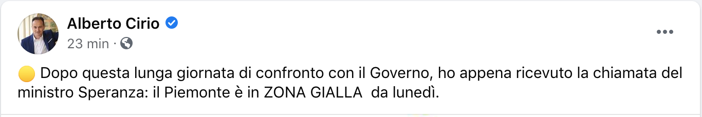 «Da lunedì il nostro Piemonte sarà giallo», annuncia il governatore dopo aver ricevuto al notizia dal ministro.