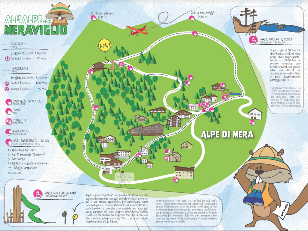Ma “La Tana” non è solo un parco giochi; per creare un vero e proprio circuito avventura, la nuova area per bambini è stata collegata ad anello con il vicino parco “Il Covo”, già presente in zona Campo dall’estate 2020, per offrire alle famiglie un’esperienza completa di divertimento e natura. A fare da guida ai ragazzi ci sarà la mascotte Meraviglio, lo scoiattolo esploratore che, grazie alla sua stazza minuta, riuscì ad addentrarsi nel bosco e scoprire i resti di una civiltà antica. Meraviglio, attraverso dei pannelli ludico – didattici posti lungo il percorso, racconterà in maniera giocosa anche la fauna, la flora e il territorio che circonda tutta l’Alpe di Mera.