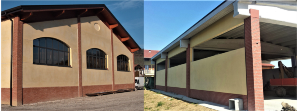 Le strutture della Prefabbricati Guerrini, nel corso degli ultimi anni e decenni, si sono evolute sempre di più per favorire l’insediamento di edifici prefabbricati con impatto sempre più adeguato anche al contesto naturale; a cominciare dalle finiture esterne dei muri e delle colonne, dove nel corso degli anni sono state introdotte finiture di pregio (un esempio è la colorazione con ossidi in pasta della facciata esterna dei pannelli di tamponamento che ha portato alla realizzazione di colorati in pasta “giallo piemonte” e “giallo lombardo), fino ai listelli di cotto del tipo “fatto a mano” o “trafilato”; in diversi casi è stata prodotta una matrice in calcestruzzo tinteggiata che ha ricreato fedelmente la finitura “paramano”. Questa finitura, in molte opere, è stata riprodotta anche sui pilastri della struttura con una soluzione innovativa che ha permesso l’esecuzione di “paraaste”, faccia a vista dall’indubbio gradevole effetto architettonico, che ha ripreso fedelmente quella che è l’architettura agricola e rurale della pianura padana e delle valli alpine.