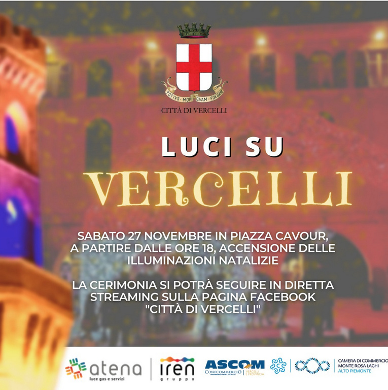 Vercelli si prepara al periodo natalizio allestendo addobbi a tema in tutta la città, dal centro alla periferia. Centro, Porta Milano, Porta Torino, Porta Casale, Isola, Cappuccini e per la prima volta anche il Concordia e via Valter Manzone al Canadà saranno illuminati con le luci a tema: un'iniziativa che ha visto la collaborazione dei commercianti, coordinati da Ascom, del Comune, di Atena Iren e di sponsor privati che hanno investito nelle zone in cui non ci sono negozi.