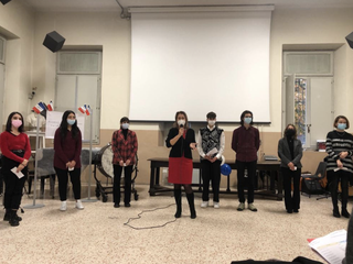 Dopo aver rotto il ghiaccio, la Presidente Casazza ha consegnato nelle mani della prof.ssa Martinella Florence e del prof. Pelaia, la targa in riconoscimento del lavoro svolto in quasi vent’anni presso l’IIS Lagrangia. È infatti la prof.ssa Martinella che, in considerazione dei numeri sempre più elevati di partecipanti alle certificazioni, si è adoperata per far riconoscere la scuola come centro esami. A fronte dei tanti successi conseguiti dagli allievi delle Scuole Medie del circondario, di diversi Istituti Superiori della città e dagli allievi dell’IIS Balbo di Casale, guidati dalla prof.ssa Bozzo Marisa e dalle sue colleghe di dipartimento, Claudia Casazza ha sottolineato come l’impegno richiesto da parte di tutti sia notevole: organizzazione e, soprattutto, passione sono gli elementi che contribuiscono alla buona riuscita degli allievi che sostengono gli esami DELF. Il conseguimento di una certificazione di lingua francese, a partire dal livello A2 fino al livello B2, contribuisce infatti ad un più facile inserimento nel mondo del lavoro, a ridurre il numero di esami da sostenere in sede universitaria nonché fornisce titolo preferenziale per i progetti di mobilità europea.