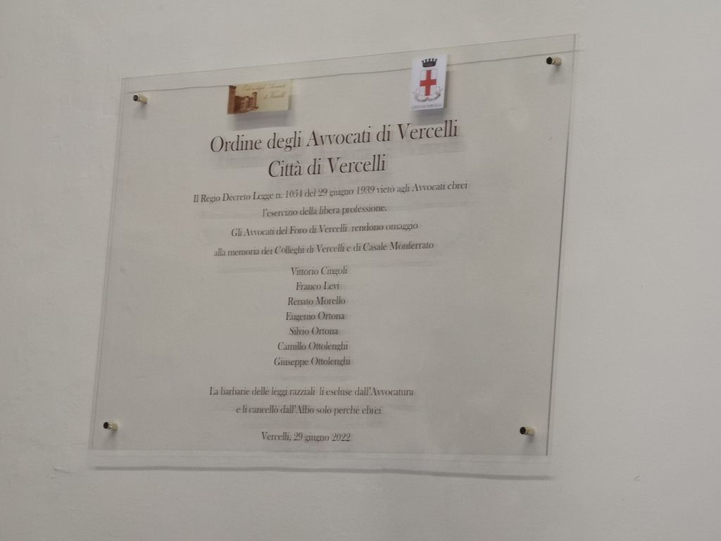 La targa, affissa nella storica sala dell'Ordine, ricorda «Vittorio Cingoli, Franco Levi, Renato Morello, Eugenio Ortona, Silvio Ortona, Camillo Ottolenghi, Giuseppe Ottolenghi. La barbarie delle leggi razziali li escluse dell'Avvocatura e li cancellò dall'Albo solo perché ebrei».