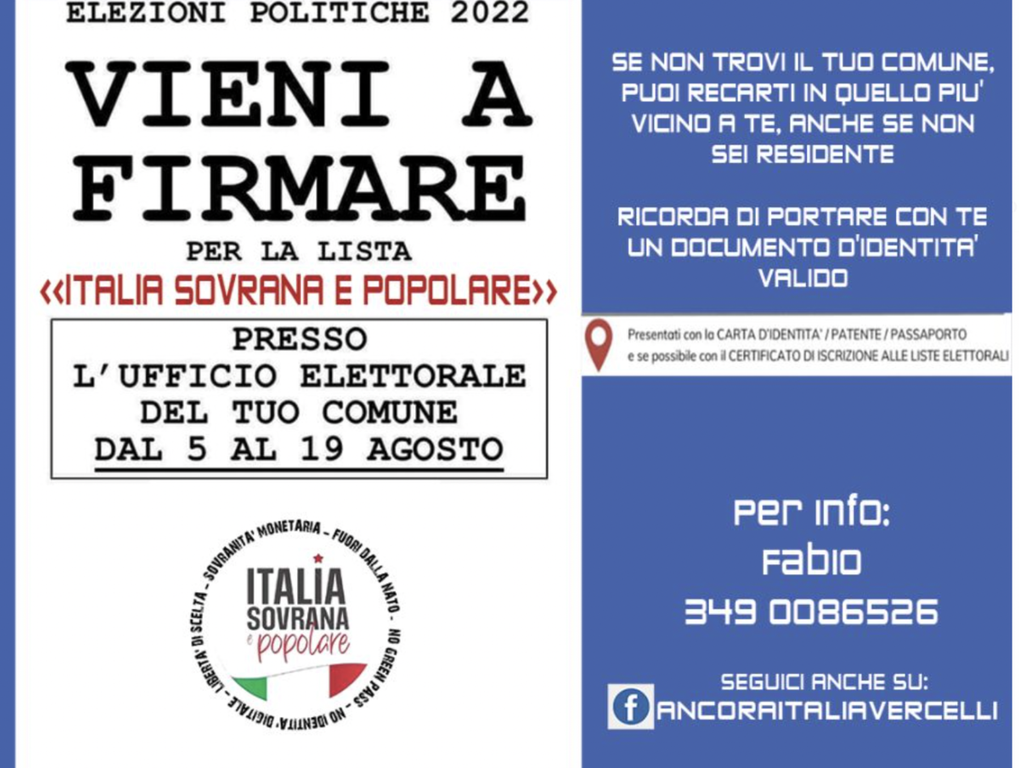 Prosegue la raccolta di firme per la presentazione dei candidati alle elezioni del 25 settembre di Italia Sovrana e Popolare (Ancora Italia, Comunisti Italiani e altre formazioni).