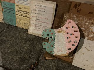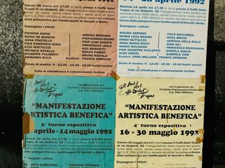 Lunedì sera, all'incrocio tra via Galileo Ferraris e via Dante qualcuno ha scaricao anche questi tabelloni, risalenti a collettive e a mostre di quasi vent'anni fa e, quasi certamente, provenienti dallo sgombero di qualche vecchio ripostiglio o di qualche cantina.