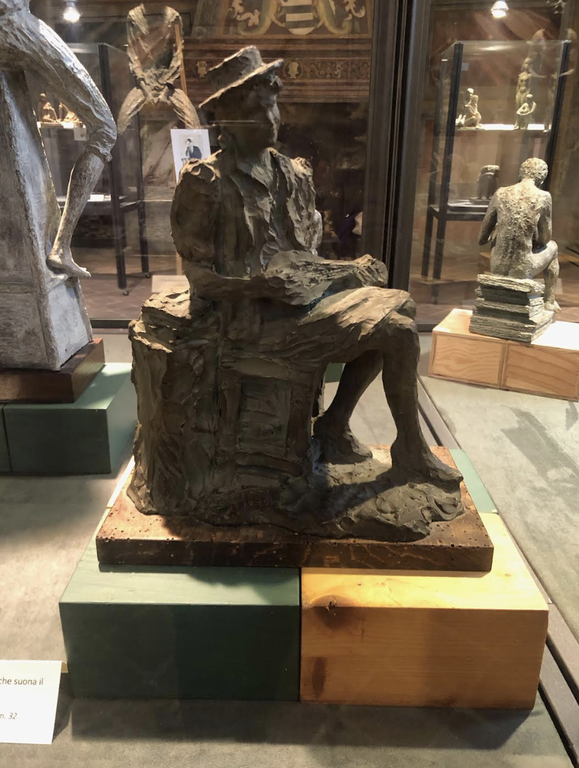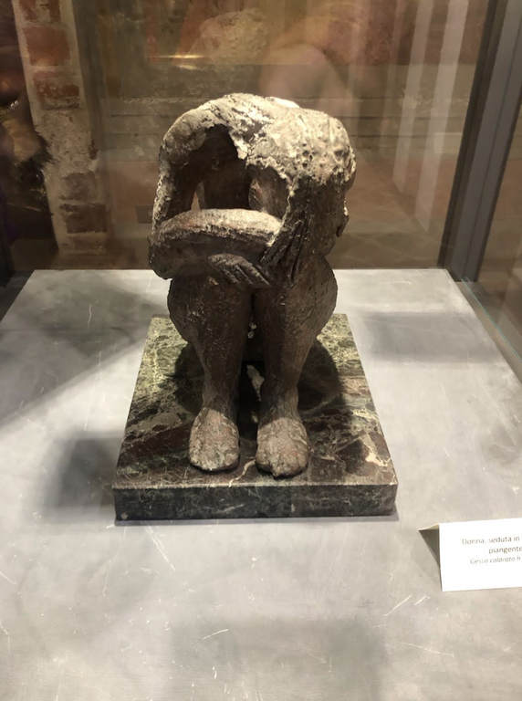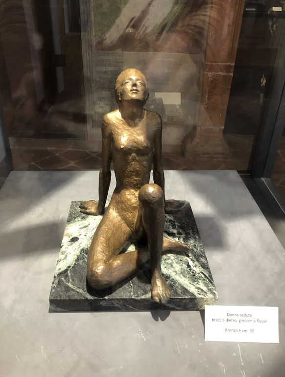 Infatti le sculture che ritraggono le due giovinette posizionate una da un lato e l'altra dall'altro della sala riflettono proprio questa dicotomia: la prima è una giovane donna gioiosa, sensuale, che sprigiona una femminilità libera da pudori e l'altra invece raccolta su se stessa, disperata, gemente. L'idea di posizionarle un questo modo è stata di Luca Brusotto. Ho da subito condiviso e apprezzato moltissimo questa contrapposizione nell'esposizione. Che si riflette e si amplifica tra le opere esposte nella vetrina centrale, che non sono ordinate cronologicamente (peraltro una missione impossibile poiché per la maggior parte delle sculture mio padre non incise la data) ma secondo un gusto etico ed estetico di contrasto, in antitesi fra loro.