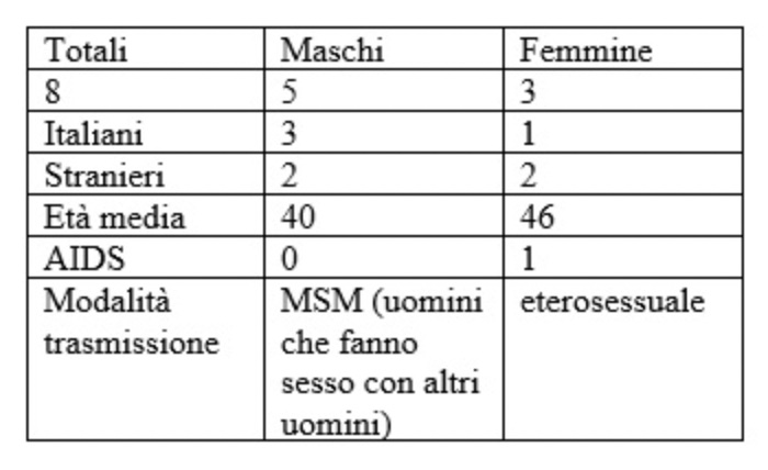 I pazienti attualmente seguiti hanno un'età media di 57 anni e sono in prevalenza di sesso maschile (95 femmine; 197 maschi). Nell'ultimo anno sono stati registrati 3 decessi (tutti maschi rispettivamente di 70, 57 e 48 anni dei quali il più giovane per patologia Aids correlata) e si sono avute 8 nuove diagnosi.
