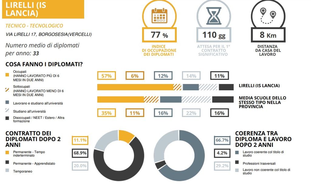 A quattro mesi dall'esame di stato circa l'80% per cento dei diplomati all’istituto tecnico Lirelli di Borgosesia ha un primo contratto di lavoro. A dirlo è la ricerca Eduscopio, edizione 2022, on line dal 29 novembre (www.eduscopio.it), il progetto della Fondazione Agnelli che analizza i dati di oltre un milione di diplomati italiani dal punto di vista dell’inserimento lavorativo e universitario allo scopo di indirizzare meglio le famiglie e i giovani nella scelta della scuola superiore.