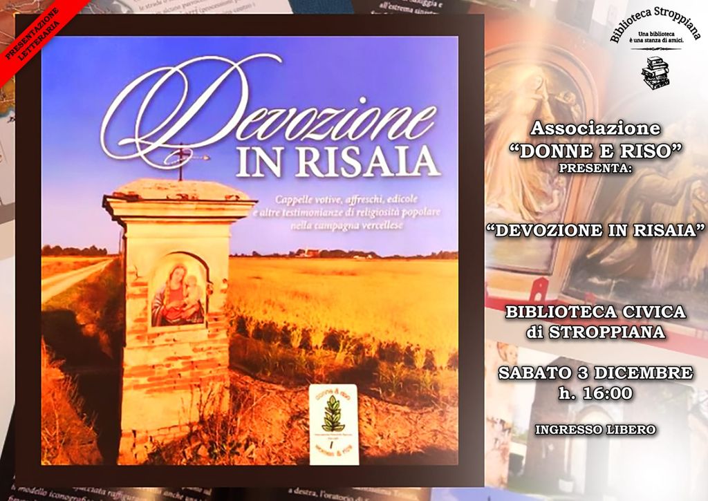 Viene presentato alle 16 di oggi, sabato 3 dicembre oer iniziativa della Biblioteca di Stroppiana, il volume "Devozione in risaia" che l'associazione "Donne e Riso" ha dedicato a cappelle ed edicole campestri sparse sul territorio vercellese. L'incontro si svolgerà nei locali delka Soms.