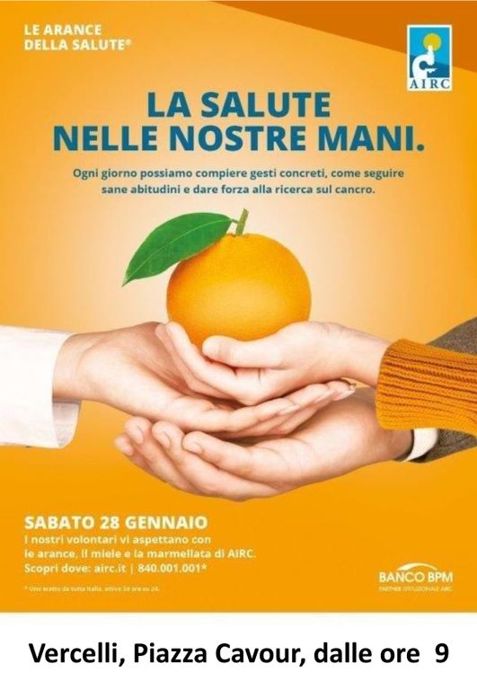 Appuntamento con le Arance della salute dell' Airc, Associazione italiana ricerca sul cancro. Nella giornata di oggi, sabato 28 gennaio, i volontari saranno presenti a Vercelli, nella Bassa e in Valsesia per vendere le reti da 2,5 chili di arance rosse italiane: l'offerta minima è di dieci euro e il ricavato è destinato a sostenere la lotta contro i tumori. A Vercelli lo stand è in piazza Cavour; in piazza Roma a Villata, in piazza Del Popolo a Prarolo, in piazza Castello a Desana, e poi ancora a Costanzana, in piazza Cavour a Tricerro, sotto l'atrio comunale a Trino, in piazza Vittorio Veneto a Santhià, in piazza Sant'Eusebio a Bianzè, in piazza Galileo Ferraris a Livorno Ferraris, e a Palazzolo. Airc sarà presente con il suo gazebo anche in piazza Mazzini a Borgosesia. Oltre alle arance saranno disponibili anche vasetti di marmellata d'arancia e di miele millefiori. Airc offre anche la possibilità di aderire alla campagna di raccolta fondi online con una donazione di 10 euro.