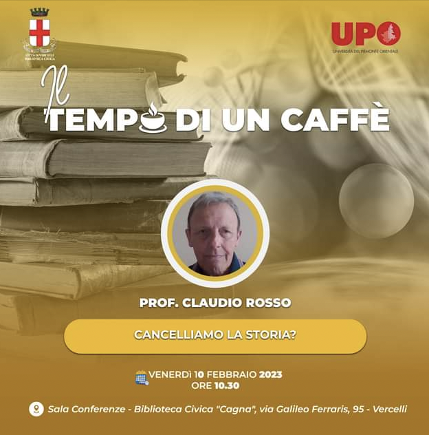 Nella mattinata di venerdì 10 febbraio, presso la sala conferenze della Biblioteca Civica di Vercelli, si è svolta una conferenza tenuta da Claudio Rosso, professore associato di Metodologia della ricerca storica presso l’Università del Piemonte Orientale (UPO) di Vercelli, intitolata: “Cancelliamo la storia?”, parte di una serie di appuntamenti settimanali, organizzati dal Comune di Vercelli in collaborazione con il prof. Filippo Fassina, chiamati Il Tempo Di Un Caffè, a cui ha partecipato la 1°A (ex IV ginnasio) del Liceo Classico Lagrangia, accompagnata dalla prof.ssa Marta Boccalini.