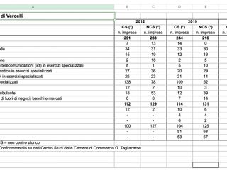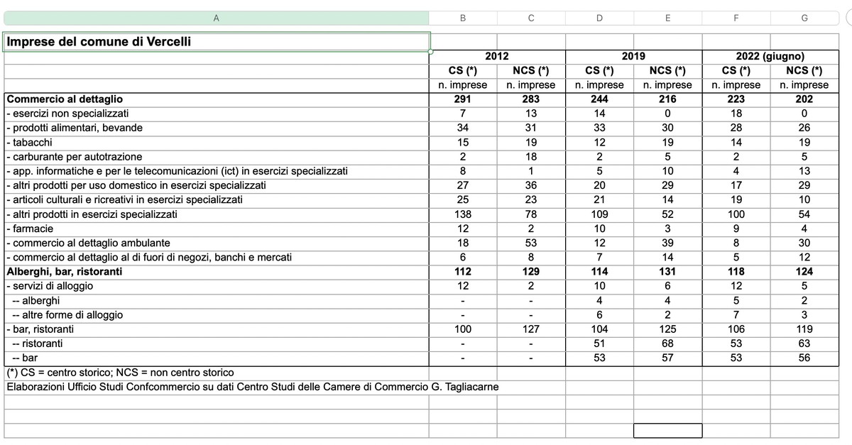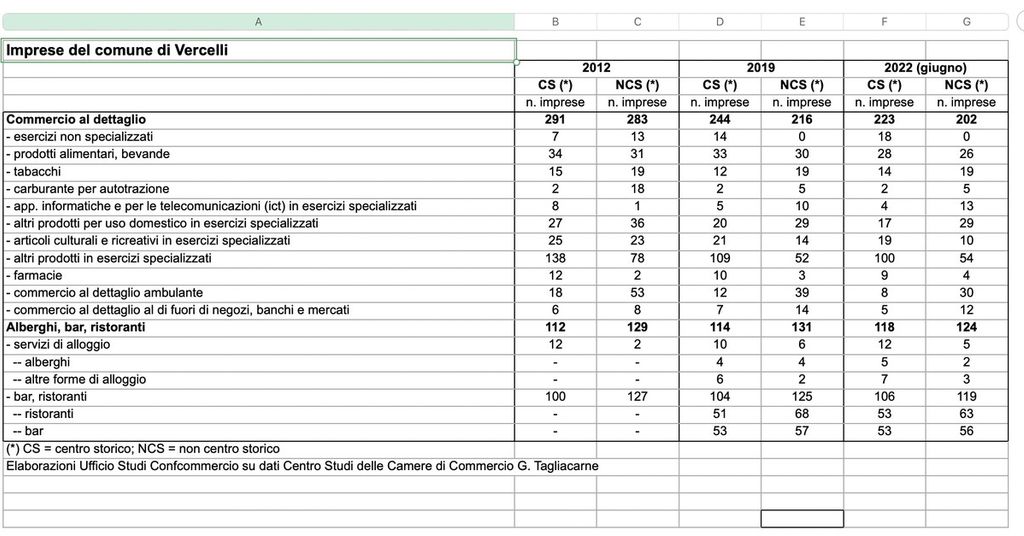 A guardare la tabella si è passati da 574 imprese di commercio al dettaglio del 2012, a 460 del 2019, per scendere a 425 nel 2022. Nel giro di tre anni, In dieci anni il saldo negativo è di 149 negozi; negli anni covid e post covid Vercelli di 35 attività.