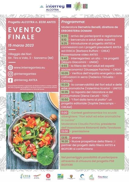 Questo progetto, candidato con successo sul programma Interreg-Alcotra 2014-2020 ha operato in un contesto di cooperazione transfrontaliera con l’obiettivo di capitalizzare i risultati e le attività prodotte in due progetti predecessori: ANTEA ed ESSICA. Il nuovo progetto ha riunito alcuni dei partner precedenti ponendo attenzione al confezionamento, alle caratteristiche nutrizionali e metaboliche legate alla salute umana. Il progetto aveva infatti tra gli obiettivi quello di divulgare la cultura dell’utilizzo dei fiori eduli accompagnati da erbe aromatiche per impiego come ingrediente di preparazioni originali e di qualità. Nello specifico Antes ha perseguito l’obiettivo di creare un modello utile ad altre filiere agro-alimentari emergenti con un ampliamento dell’offerta produttiva per i fiori commestibili.