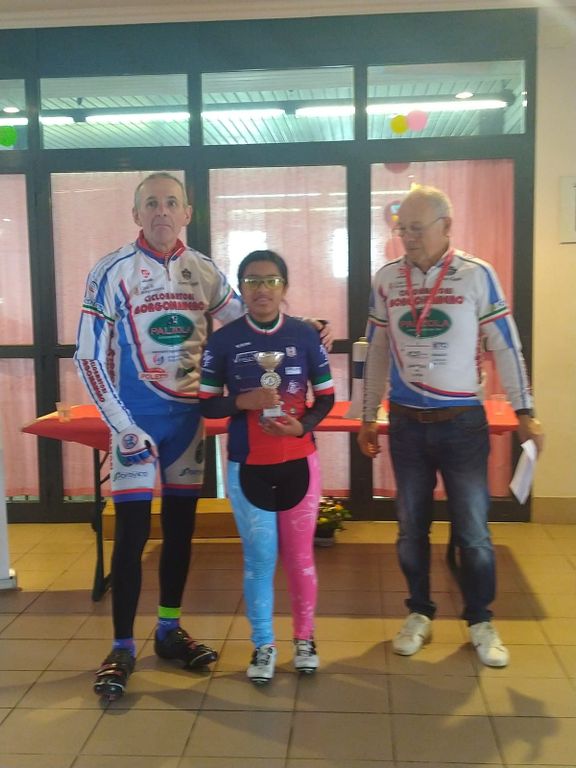 A Borgomanero invece, per la Cicloturistica “Memorial Carmelo Crobu” organizzata dalla società Cicloamatori Borgomanero, la partecipazione del Velo Club Vercelli è stata di natura “familiare”: oltre a Piero e Mattia Sanzone, nonno e nipote, erano presenti anche Josè Flores con i figli Fabio e Valentina: per quest’ultima, alla sua prima volta in assoluto in una manifestazione ciclistica, la seconda parte del percorso si è rivelata molto difficile e faticosa, per la distanza e il vento contrario. Grazie all’aiuto dei compagni di squadra che l’hanno tenuta “coperta” in gruppo, è riuscita a portare al traguardo finale la bicicletta. E le sue sofferenze sono state ripagate dalla conquista del trofeo (la prima coppa!) per la partecipante più giovane di giornata (12 anni).