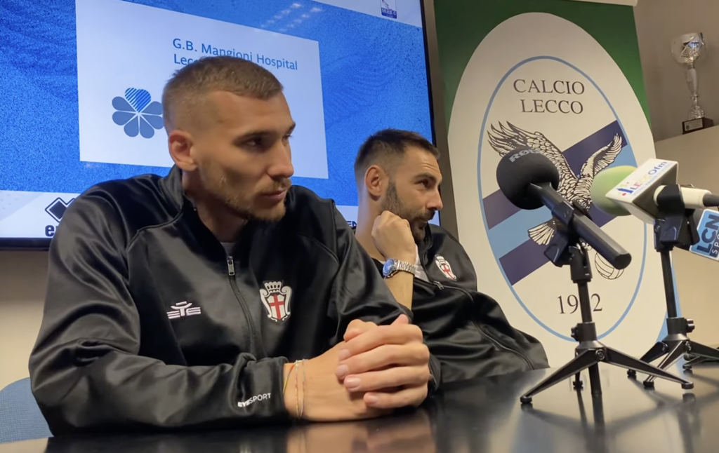 Finale di partita con l'addetto stampa della Pro Vercelli, Piccica, che intervista i due capitani: quello fermo da 12 gare, Comi, e quello del pareggio decisivo di Lecco, Cristini.