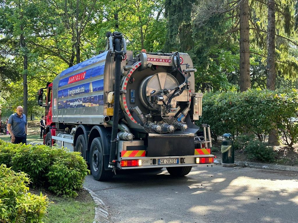 Intervento di risanamento, con l'utilizzo di un mezzo idrovoro, per l'area di parco Camana dove si trovano le altalene dove, storicamente, a ogni temporale si crea una specie di lago a causa del pessimo drenaggio e della conformazione del terreno.