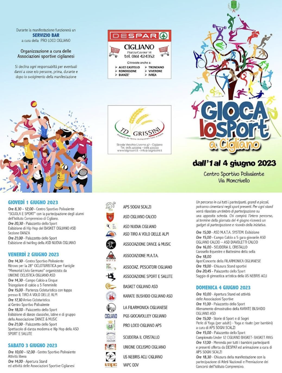 Da ieri sera a domenica il PalaGerardi e le sue strutture all’aperto ospitano esibizioni da parte dei sodalizi: Nebris Acli, Unione Ciclismo Cigliano, Giocavolley, Karate Bushido Cigliano, Basket Cigliano, Sport e Salute, Pescatori Cigliano, Associazione M.A.T.A., Dance & Music, Tiro a volo delle Alpi, Nuova Cigliano, Sogni Scalzi, Cigliano Calcio, Scuderia il Cristallo. La manifestazione conta anche il contributo di: Pro Loco Cigliano, Vapc e Filarmonica.