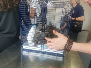 Il primo paziente è un bellissimo gattone grigio che, dal suo trasportino, guarda con un po' di inquietudine tutto il via vai di persone che entrano ed escono dalla sala dell'ambulatorio.