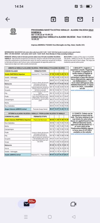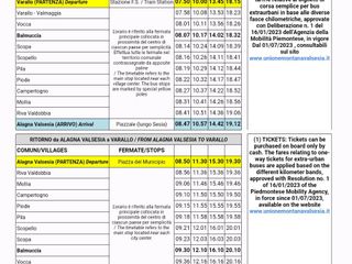 Il biglietto si farà a bordo, al prezzo stabilito dal tariffario regionale in base alle fasce chilometriche, la navetta rispetterà tutte le fermate dei bus ATAP e gli orari saranno articolati in modo da consentire una prima corsa al mattino presto (7,50 Varallo-Alagna, 8,50 Alagna-Varallo) ed un’ultima corsa la sera alle 19,30 da Alagna verso Varallo (18,15 Varallo-Alagna), oltre a due corse intermedie a metà mattina e metà pomeriggio in entrambe le direzioni.