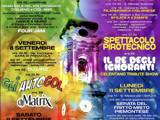 Segnaliamo che domenica 10 settembre si esibirà la Filarmonica Ciglianese, mentre il Luna Park sarà in funzione fino al 12 settembre, giorno in cui è prevista una simpatica sorpresa. Per l’intera durata della manifestazione, sotto l’Ala, è attivo il banco di beneficenza.