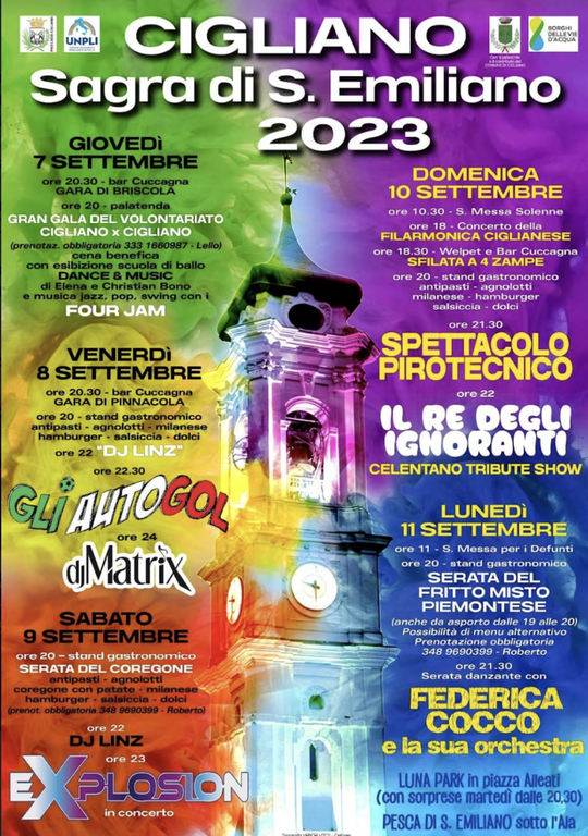 «Abbiamo iniziato con la Fiera di Sant’Emiliano, una giornata con una grande affluenza di pubblico, dedicata ai dolci tipici del paese (proposti dalle panetterie), bar e negozi aperti, le immancabili bancarelle, lo stand della Pro Loco con le frittelle e quelli delle associazioni locali, in piazza Martiri abbiamo rivisto i giochi “dei nonni” spazio riservato ai bambini.- La Sagra di Sant’Emiliano entra nel vivo giovedì con il Gran Galà del Volontariato (cena benefica con le attrazioni Dance e Music e Four Jam). -Venerdì -prosegue Autino- avremo Gli Autogol e il dj Matrix, mentre sabato il gruppo Gli Explosion, un evidente orientamento verso i giovani, visto che saranno coinvolte anche le Leve.- Durante tutte le serate sarà attivo il servizio cucina che propone menù diversificati di grande qualità. -Domenica -conclude il presidente Autino- dopo lo spettacolo pirotecnico, ci sarà un gradito tributo a Celentano con Il re degli ignoranti, lunedì tocca a Federica Cocco e la sua orchestra. Da non dimenticare l’opportunità di cenare con il fritto misto alla piemontese preparato dallo stand gastronomico della Pro Loco. Un ringraziamento per la collaborazione va al Comune ed a tutti gli sponsor, dagli artigiani ai commercianti.»