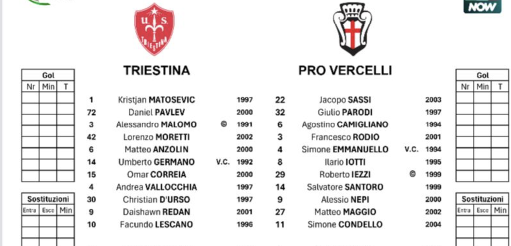 TRIESTINA (4-3-1-2): Matosevic; Pavlev, Moretti, Malomo, Anzolin; Germano, Correia, Vallocchia; D’Urso; Lescano, Redan. A disposizione: Bolzon, Agostino, Struna, El Azrak, Ciofani, Kacinari, Kozlowski, Fofana, Celeghin, Finotto, Rizzo, Pierobon. All. Tesser.