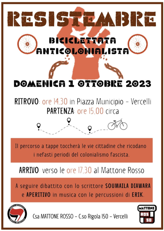 Il Comitato Antifascista e Antirazzista di Vercelli domenica 1 ottobre organizza una Biciclettata anticolonialista nell'ambito dell'evento "Resistembre" ormai giunto alla sua terza edizione.