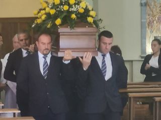 All'esterno della chiesa, accanto alla foto di Lombardo, le corone della Sigifer, di Rfi, dei parenti di Laganà, degli amici dell'Isola: sul feretro un cuscino di rose gialle e l'abbraccio disperato della moglie, Barbara, che non si stacca neppure un attimo per tutta la funzione.